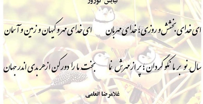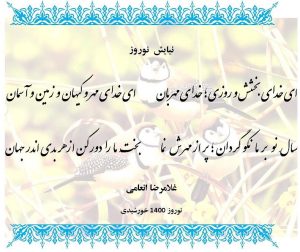 نیایش نوروز توسط غلامرضا انعامی منتشر شده 24 اسفند 1399 کاروان شعر نیایش نوروز ای خدای بخشش و روزی ؛ خدای مهربان ای خدای مهر و کیهان و زمین و آسمان سالِ نو بر ما نکو گردان؛ پر از مهرش نما بختِ ما را دور کن از هر بدی اندر جهان غلامرضا انعامی مرتبط: بهارانه ی ۱۴۰۳ نوروز مبارک باد نظر سنجی سازمان ملل در مورد درج نوروز در تقویم بین المللی به عنوان یک روز جهانی