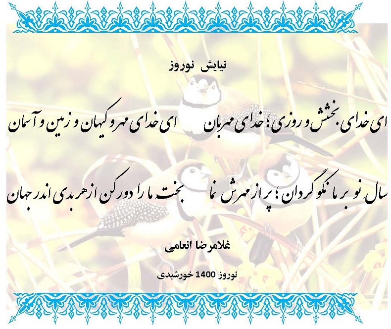 غلامرضا انعامی 25 اسفند 1399 در 13:30 پاسخ درود وسپاس از توجه و لطفت. امیدوارم سال نو برایت سال بهترین ها باشه و خجسته و مبارک. شاد و تندرست باشی.