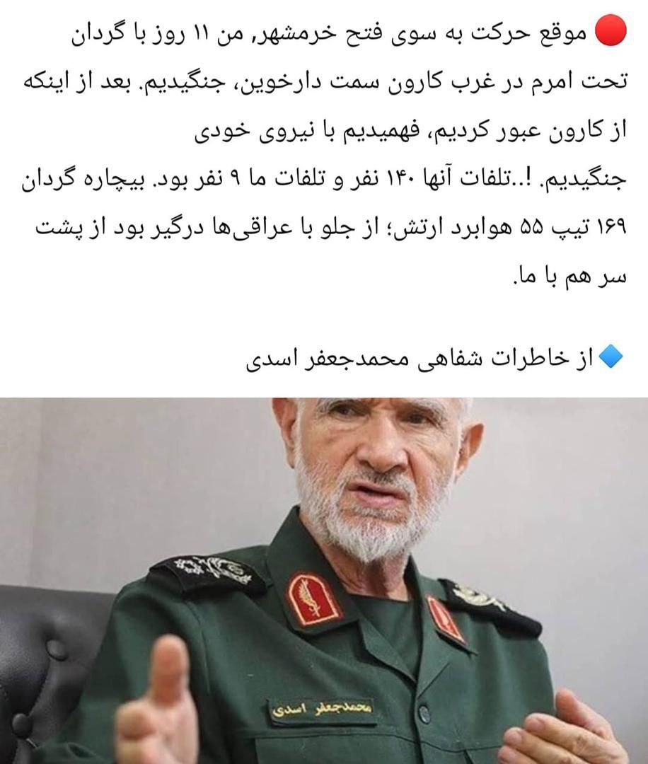از خاطرات محمد جعفر اسدی توسط خسروبیگی منتشر شده 21 شهریور 1404 عمومی شرح در تصویر مجهز به لینک وای وای وای از جنگ!!! مرتبط: محمد نوری زاد مادر محمد: شب آخر گفت می خواهم در آغوش تو بخوابم متن آهنگ ای ایران محمد نوری