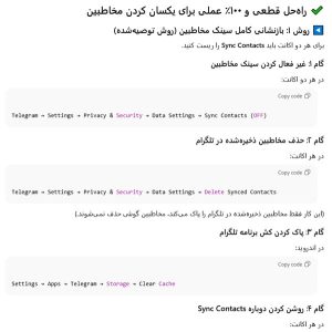 5- در روش 2 هوشیار گفت روی گوشی از برنامه Google Contacts (برای منبع واحد) استفاده کنم. سپس تمام مراحل روش 1 را دنبال کرده و “صبر کنم تا سینک کامل” شود. این کارها را هم کردم و نشد! هوشیار گفت: “تلگرام در بعضی نسخهها درست سینک نمیکند (Bug واقعی)”