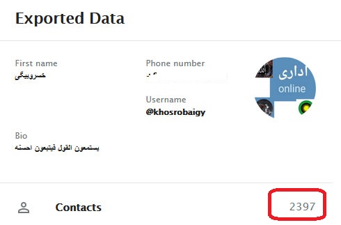 1- برای اینکه تعداد مخاطبین اکانت تلگرامتون را ببینید؛ با نسخه دسکتاپ تلگرام یک اکسپورت از contacts تهیه کنید. فایل خروجی با فرمت html را باز کنید. تعداد مخاطبین را مانند شکل زیر نمایش میدهد.