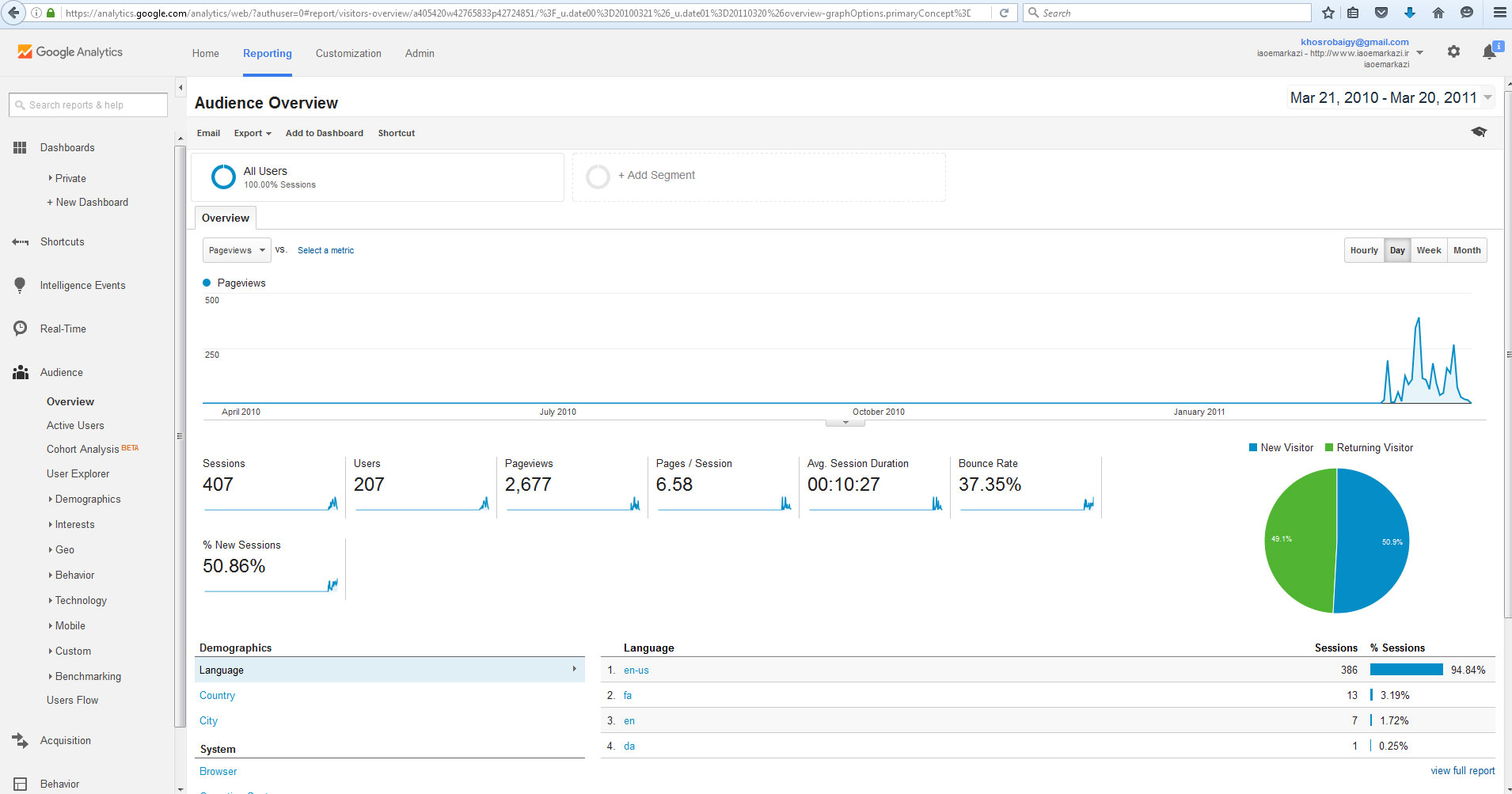 بدون شک استفاده از اینترنت بعنوان یک ابزار مدرن اطلاعرسانی، مستلزم بکارگیری صحیح آن توام با رعایت الزامات فنی مربوطه است. رعایت استانداردهای مهندسی وب کمک میکند که استفاده از پایگاه اینترنتی توام با موفقیت در اطلاعرسانی باشد. یکی از توصیههای متخصصان وب به صاحبان سایتها، بکارگیری یک سرویس برای بررسی و مانیتور کردن آمار بازدید میباشد. ما از زمان راهاندازی سایت جدید (۲۲ فوریه ۲۰۱۱ مصادف با ۳ اسفند ۱۳۸۹) از آمارگیر گوگل google analytics برای این منظور استفاده کردهایم. نتایج اولیه در شکل زیر نمایش داده شده است: